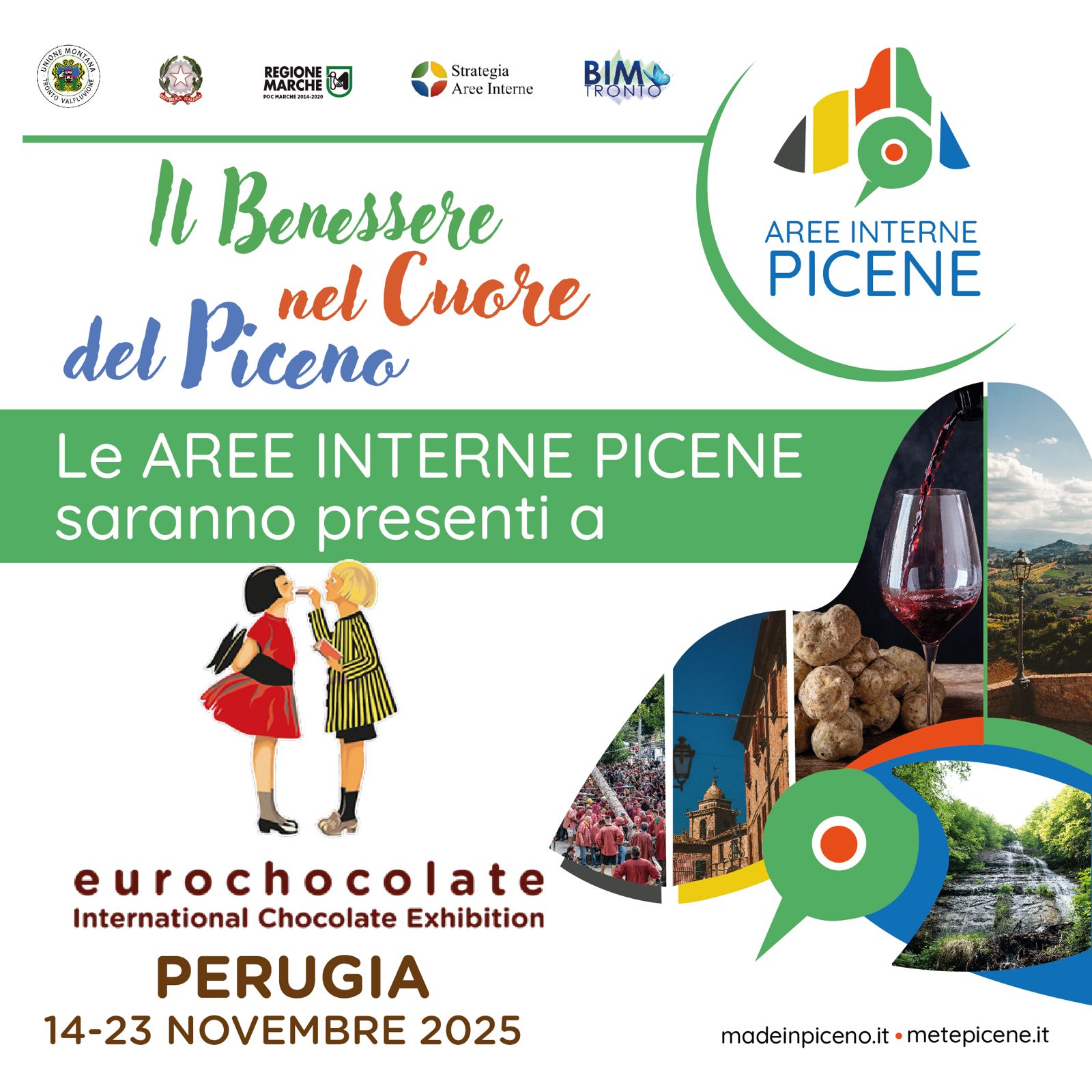 Il progetto Snai Aree Interne Picene – promosso dalla Regione Marche all’interno della Strategia Nazionale Aree Interne (area interna Ascoli Piceno) con Fondi POC Marche 2014-2020, il cui Ente capofila è l’Unione Montana del Tronto e Valfluvione, debutta in grande stile a Eurochocolate di Perugia dal 14 al 23 Novembre, la grande festa del cioccolato, nel centro storico del capoluogo umbro con circa un milione di visitatori provenienti da tutta Italia e da diversi Paesi europei.